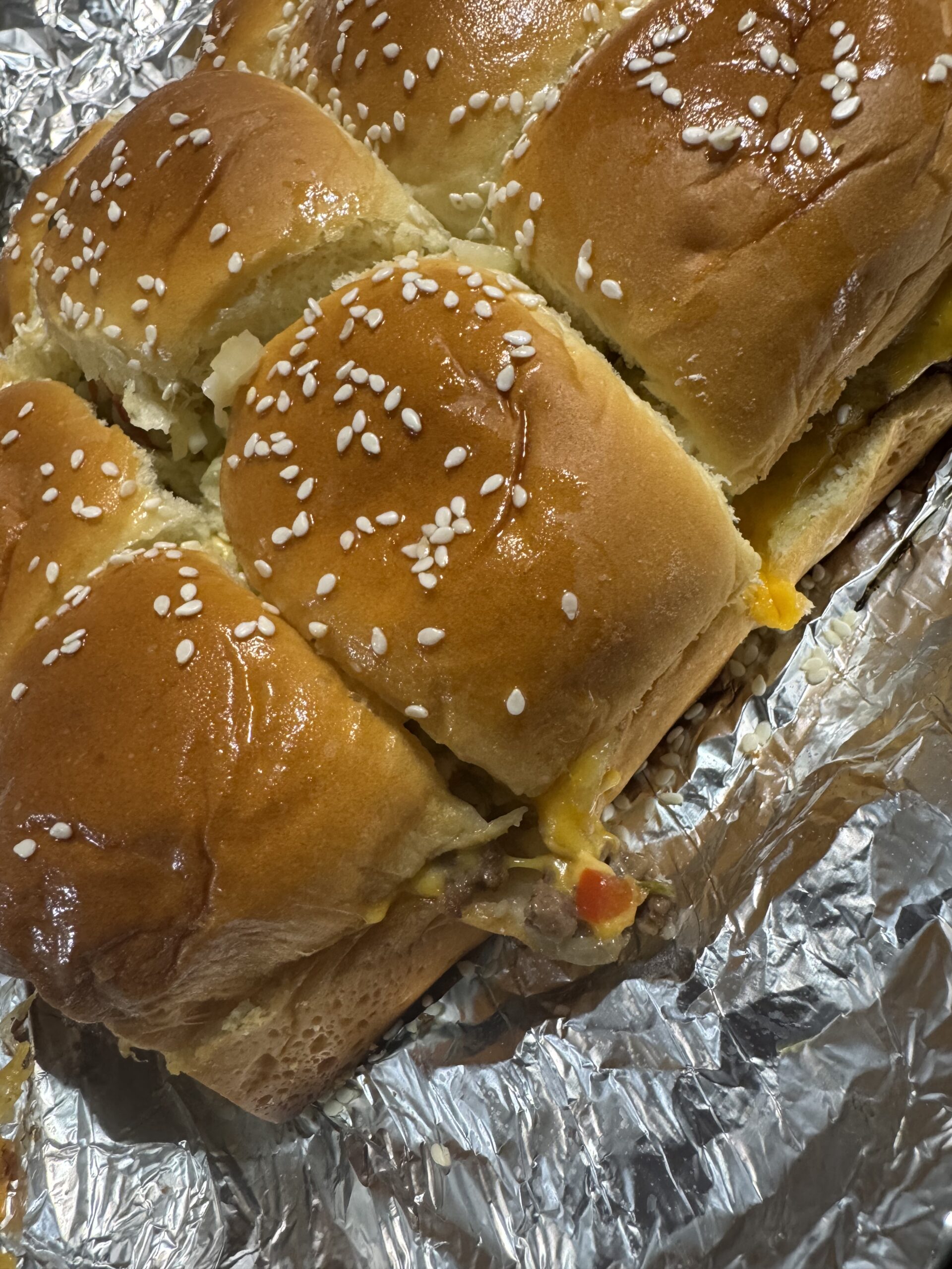 - Put Hawaiian Roll on tin foil and cut in half. Layer beef mixture on top.
